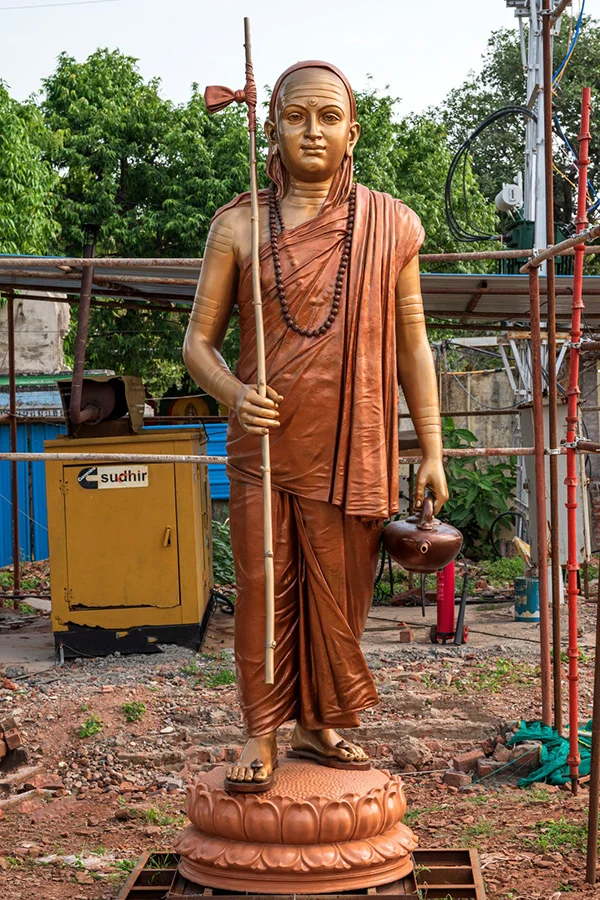 Adi Shankara (788-820) defendió la idea filosófica de que "Brahman y Atman son uno", creyendo que la realidad suprema del universo, "Brahman", es esencialmente la misma que el alma individual, "Atman". Para reflejar este profundo concepto, el equipo de diseño de Jiangxi Tongqing estudió a fondo el "Comentario del Sutra del Brahma" de Shankara y transformó su connotación filosófica en lenguaje visual: la estatua se presenta en postura meditativa, que simboliza la realización suprema de "Brahman"; la expresión facial es solemne y distante, con la mirada baja y la mirada fija en la palma de la mano, en consonancia con la práctica de la "introspección de la propia naturaleza"; los pliegues de la ropa adoptan el patrón espiral del sari tradicional indio, pero están reconstruidos con líneas metálicas fluidas, lo que no solo conserva los símbolos culturales, sino que también confiere a las esculturas modernas una belleza dinámica.
